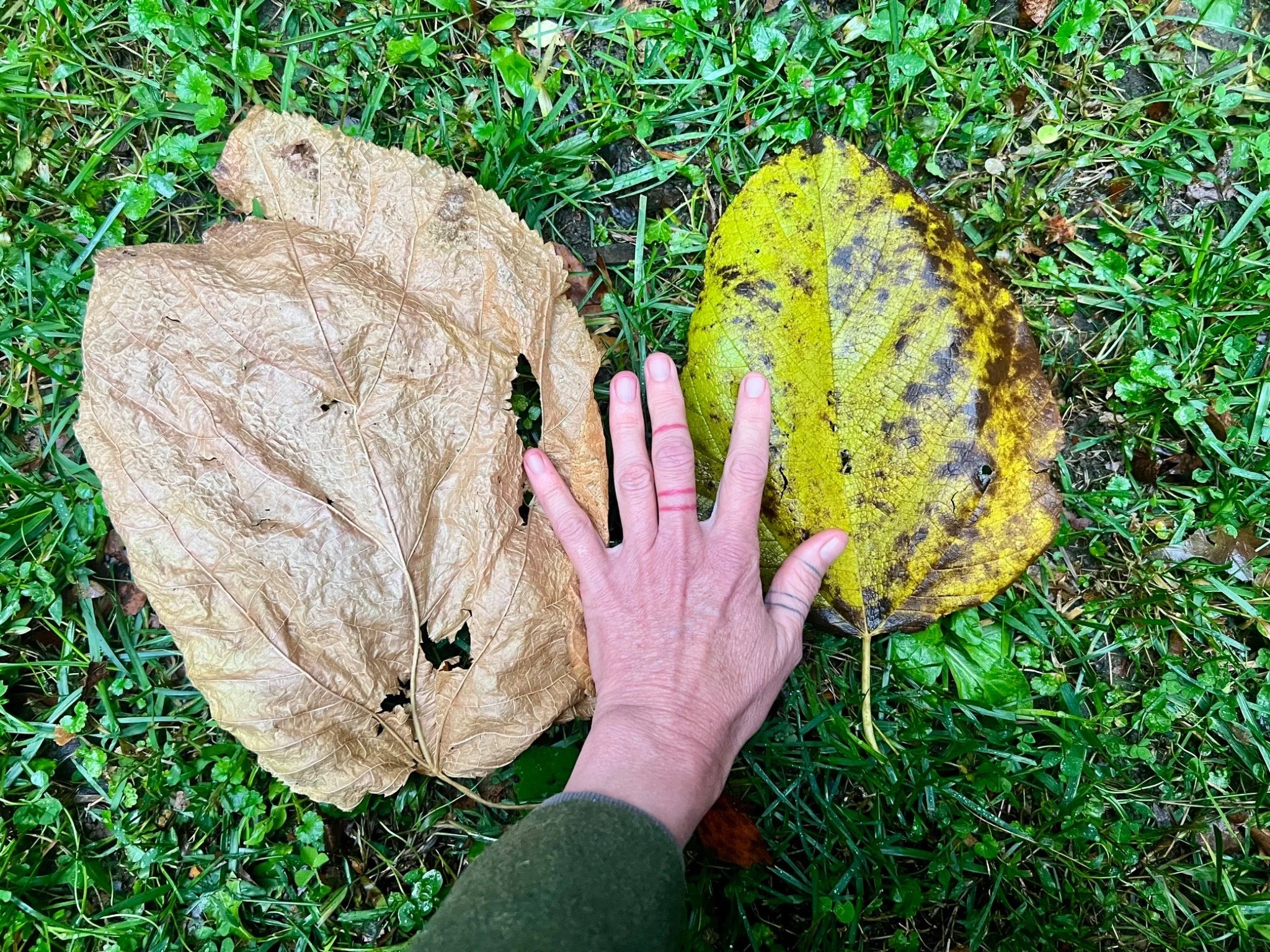 The autumn color has been SPECTACULAR this year! I love each season for its own reasons, and along with many other folks, I believe Autumn around here is extra special. In addition to the astounding beauty, the naturalist in me appreciates that I notice the tree leaves as individuals in a different way as they change color than I do when they’re in summertime’s concert of greens. One such leaf stood out to me last week on a walk. I noticed how HUGE they were, on the ground and yellow, underneath a tree I’m not sure I’d paid attention to before.